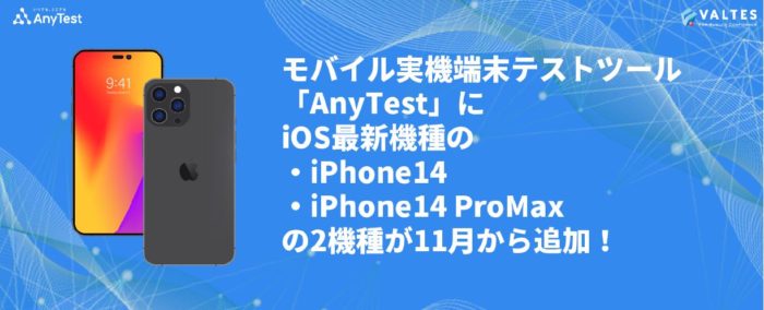 ソフトウェアのテスト・品質向上支援サービスを提供するバルテス株式会社(本社:大阪市西区、東京都千代田区、代表取締役社長:田中 真史、以下バルテス)が提供する「AnyTest」に、新しくiPnone14、iPhone14 Pro Maxを追加しました。