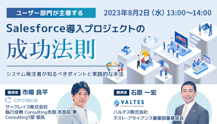 ソフトウェアのテスト・品質向上支援サービスを提供するバルテス株式会社(本社:大阪市西区、東京都千代田区、代表取締役社長:田中 真史)は、サークレイス株式会社(本社:東京都中央区、代表取締役社長:佐藤 潤)と共催し、無料Webセミナー「ユーザー部門が主導するSalesforce導入プロジェクトの成功法則―システム発注者が知るべきポイントと実践的な手法」を2023年8月2日(水)に開催することをお知らせいたします。