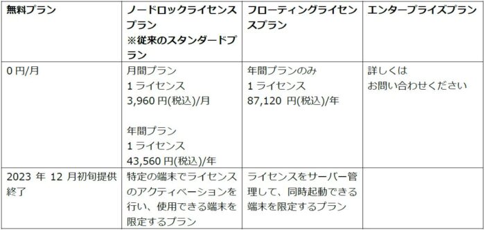 従来のスタンダードプランは、「ノードロックライセンスプラン」へと名称変更になり、新規にフローティングライセンスプランを追加いたしました。