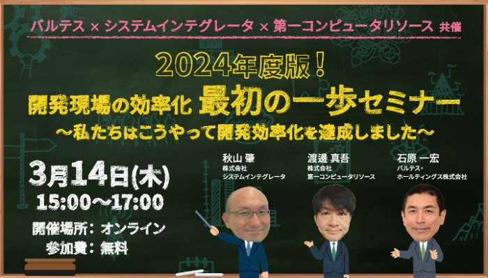当社は、2024年3月14日(木)に無料Webセミナー「2024年度版!開発現場の効率化最初の一歩セミナー~私たちはこうやって開発効率化を達成しました~」を開催いたします。