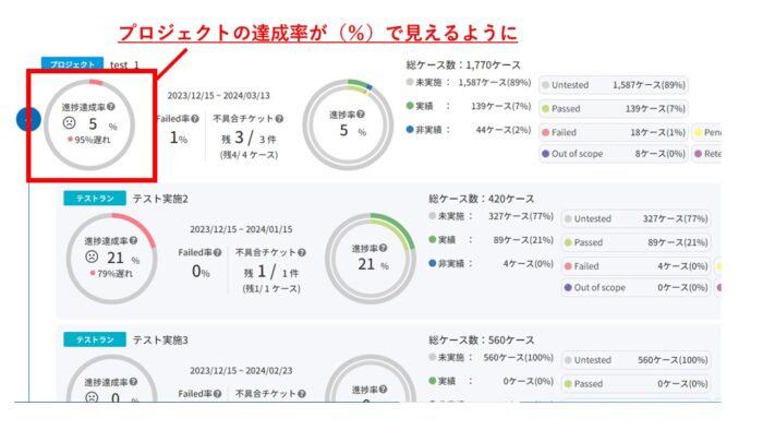 全体ダッシュボード:プロジェクト達成率が割合(%)で可視化