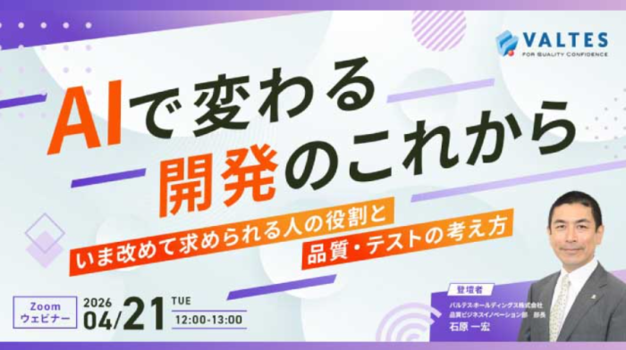 バルテス株式会社は、2026年4月21日(火)に「AIで変わる開発のこれから いま改めて求められる人の役割と品質・テストの考え方」をテーマとした無料オンラインセミナーを開催いたします。