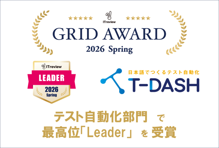 今回の「ITreview Grid Award 2026 Spring」テスト自動化ツール部門における「Leader」受賞は、「T-DASH」が多くのユーザーから支持をいただいていることの表れであると受け止めています。
